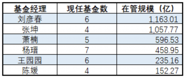 刘彦春、张坤、萧楠作为老牌基金经理,在管理规模方面较杨瑨、王园园和陈媛更大,尤其刘彦春和张坤,已晋身“千亿俱乐部”,对于基金经理的管理能力、灵活度提出了更大的挑战和限制。
